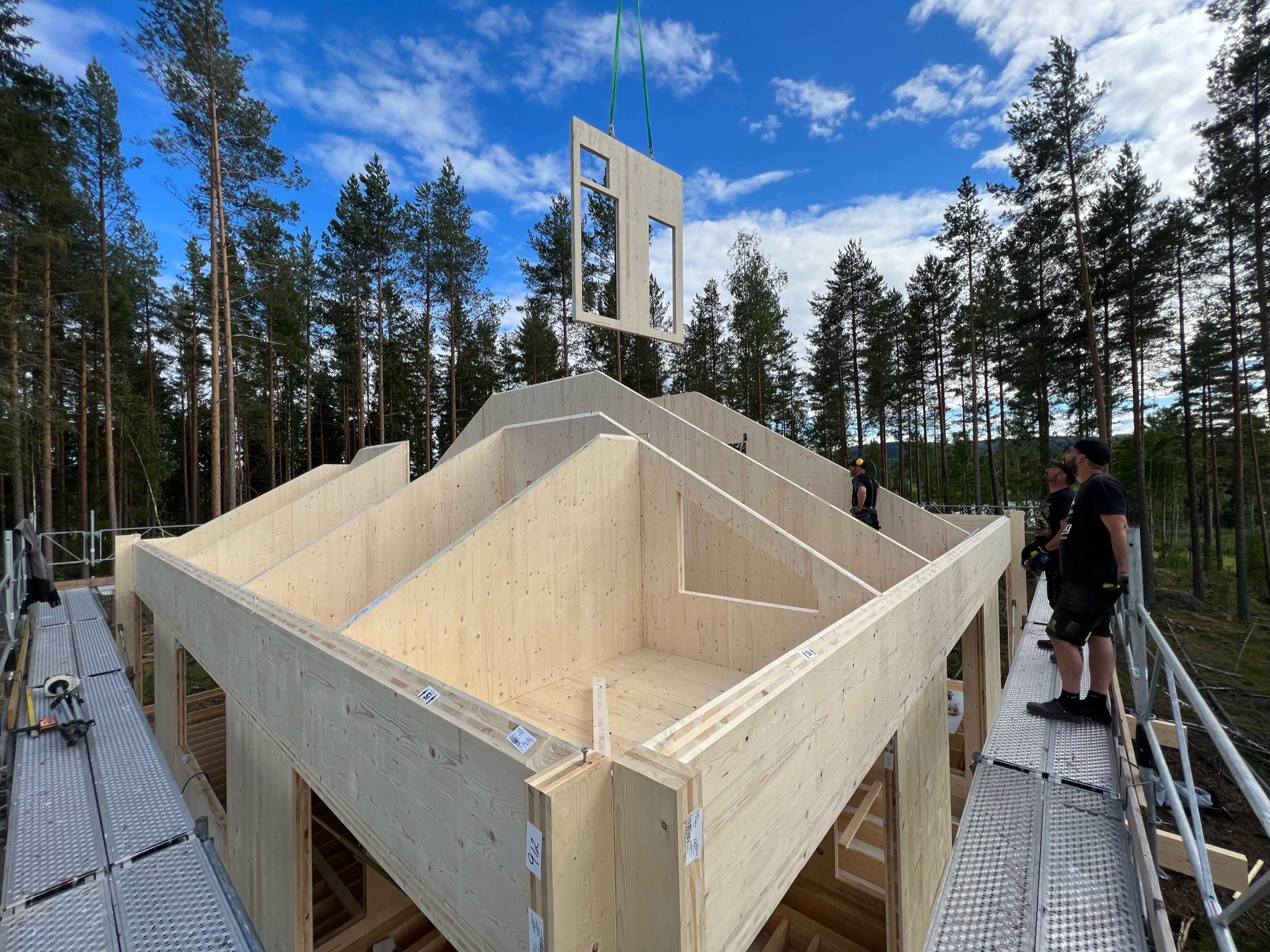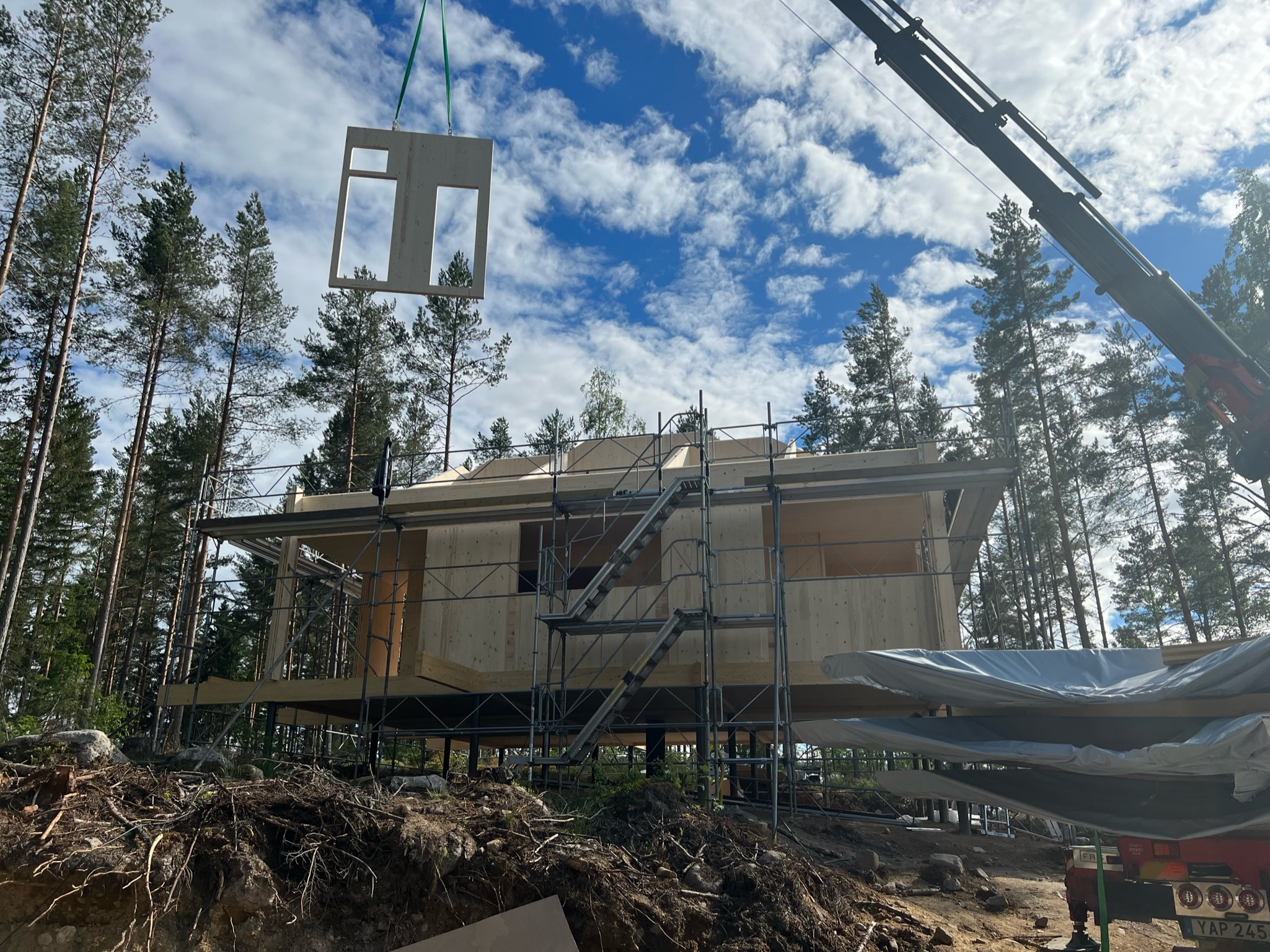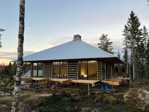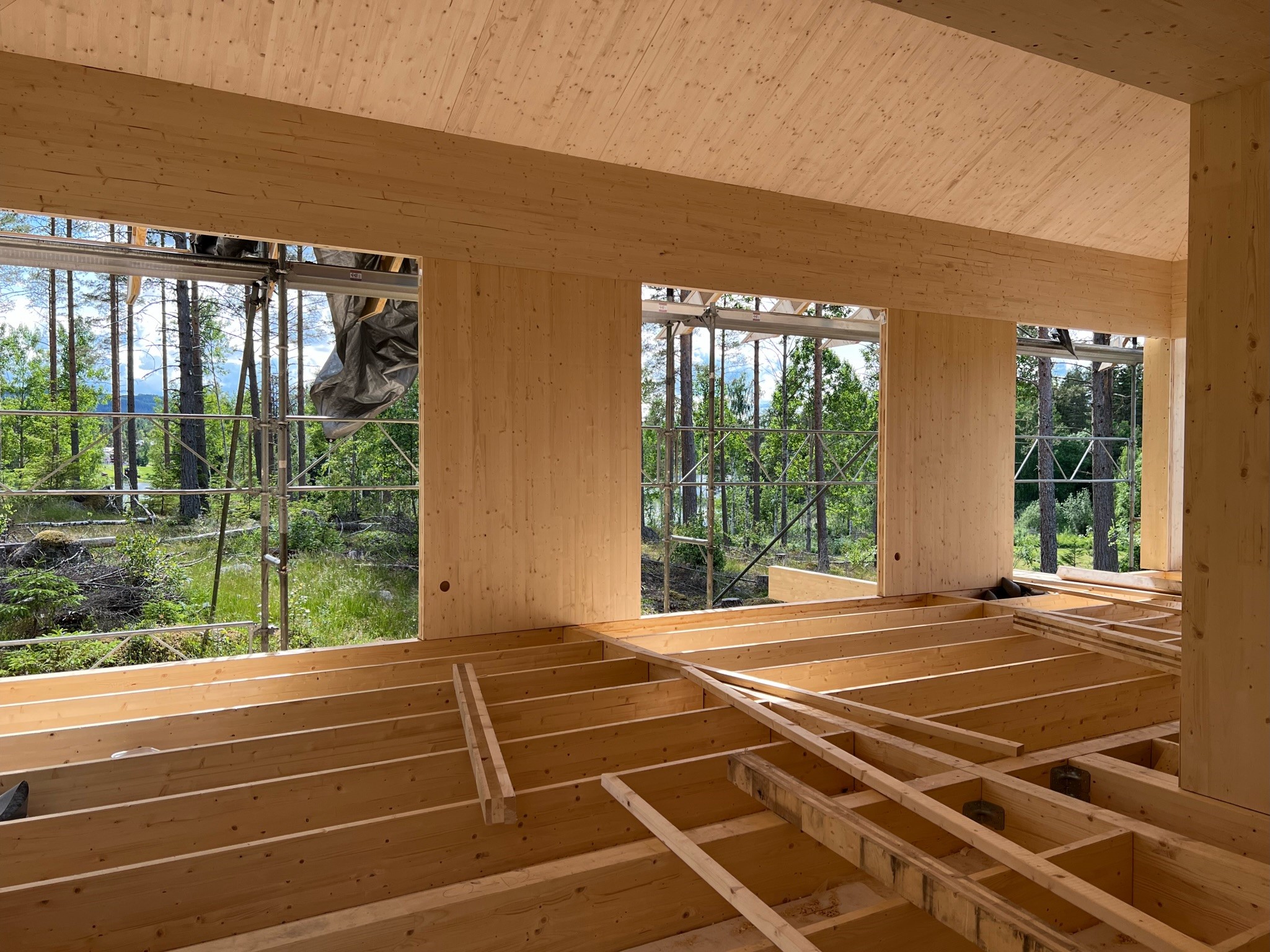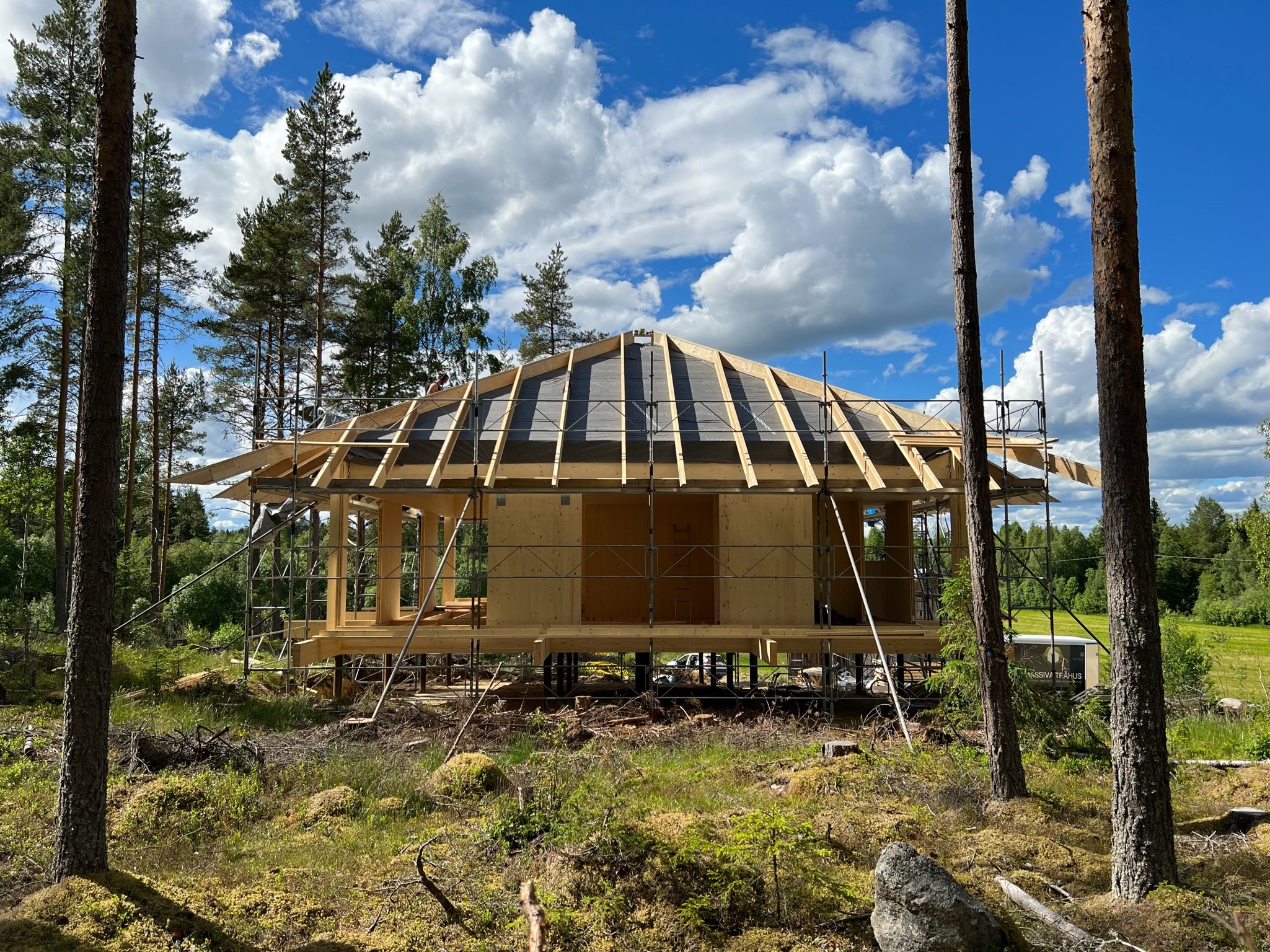 Fritidshus i Hälsingland med stomme och invändiga ytskikt av massivt KLT (korslimmat trä). Planlösningen är kvadratisk med stora fönster mot skog och sjö. Pyramidtakets överhäng skyddar mot värme på sommaren och mot snö på vintern men släpper in den låga vintersolen. Utvändig fasadpanel är av bränd och borstad furu.