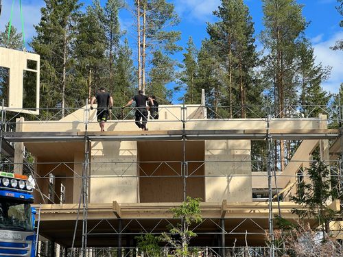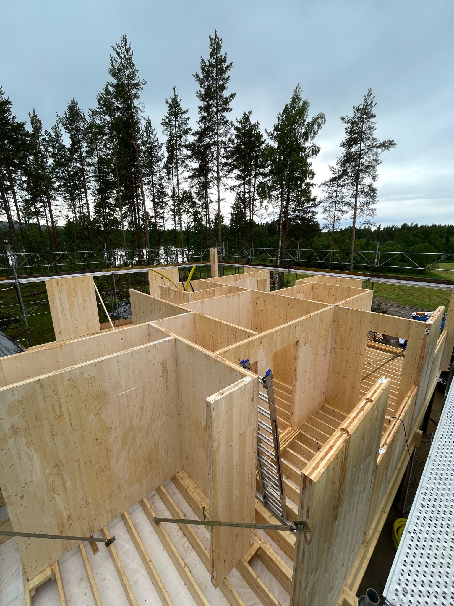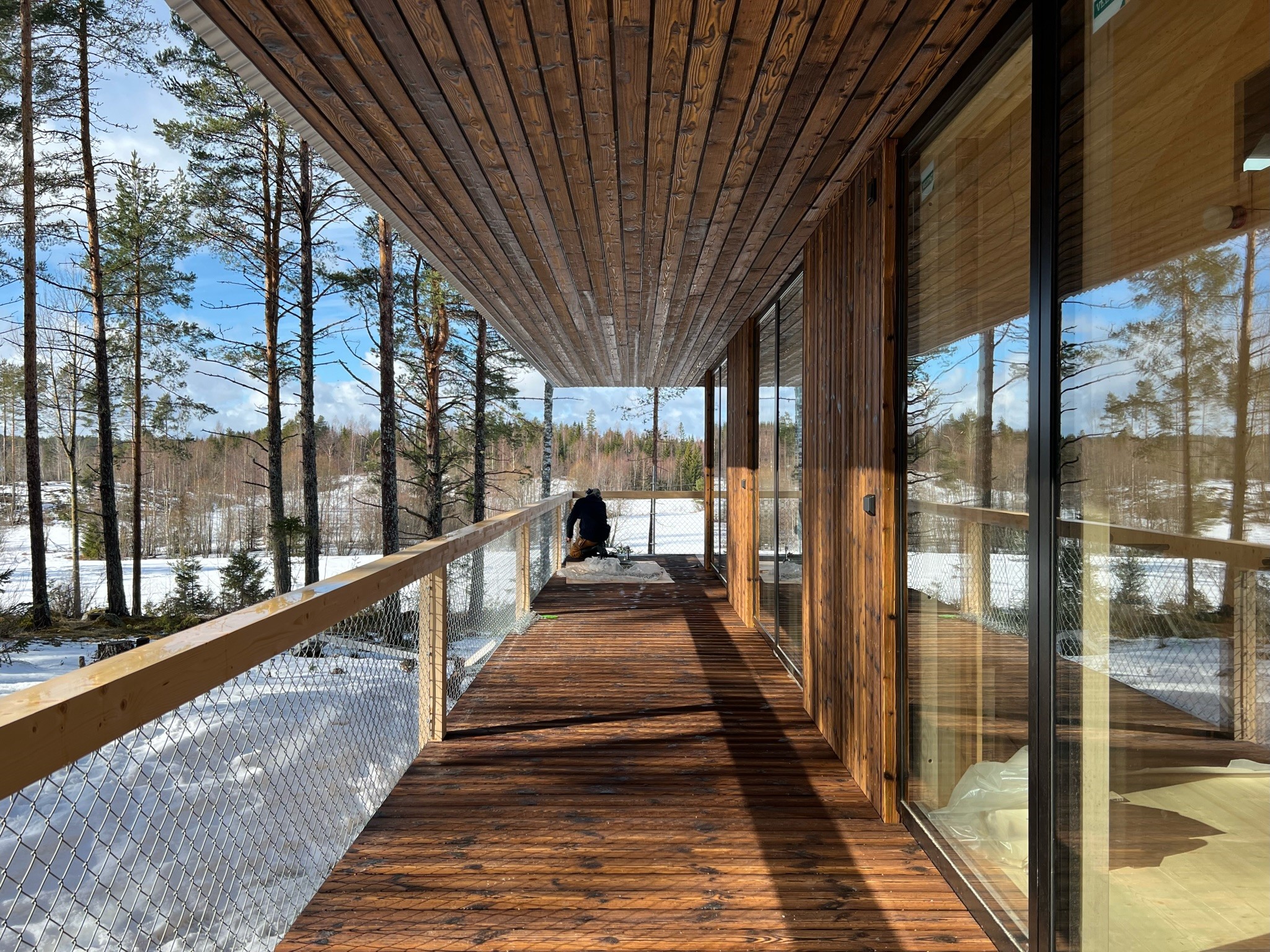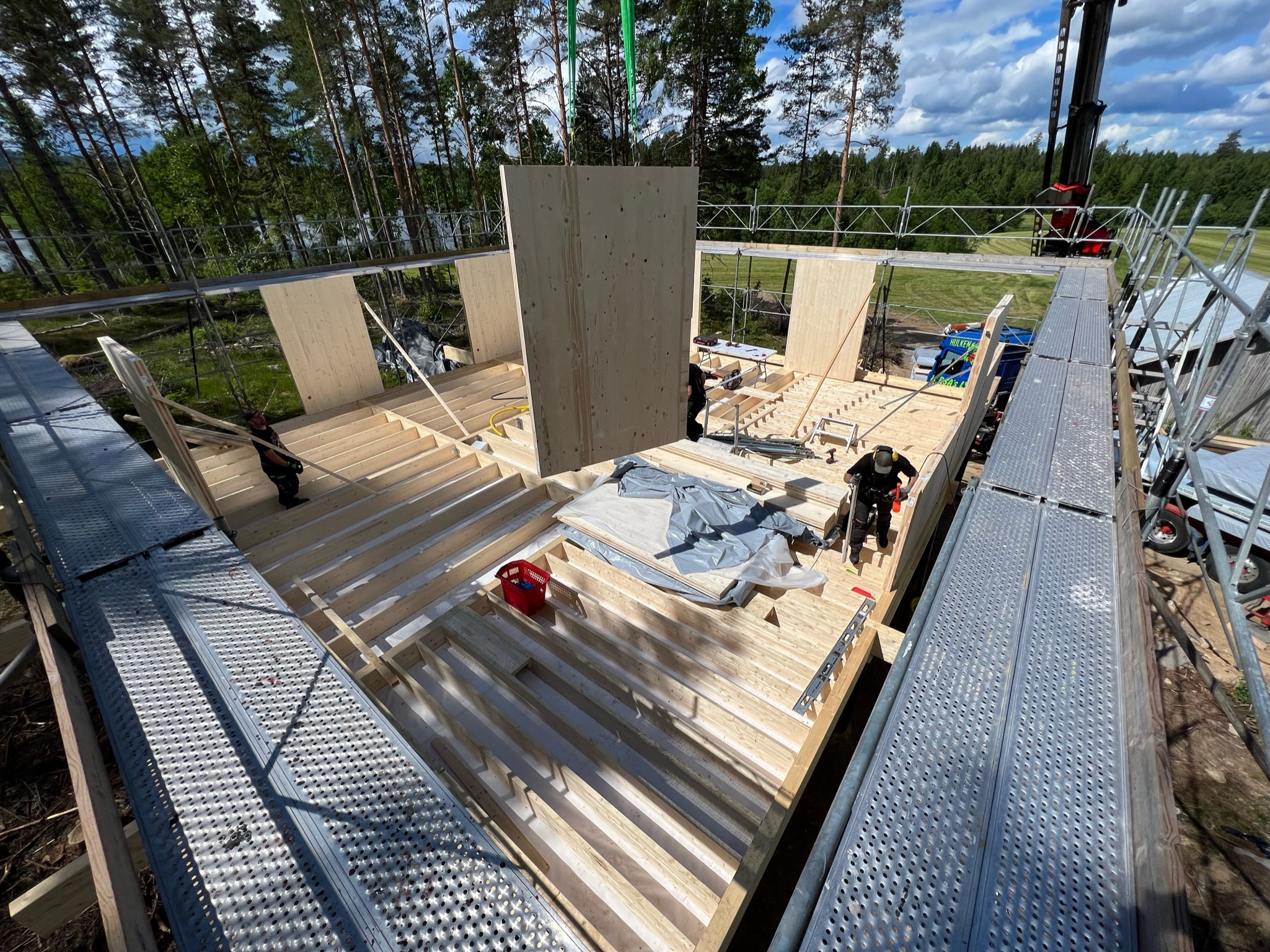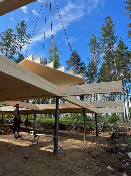 Fritidshus i Hälsingland med stomme och invändiga ytskikt av massivt KLT (korslimmat trä). Planlösningen är kvadratisk med stora fönster mot skog och sjö. Pyramidtakets överhäng skyddar mot värme på sommaren och mot snö på vintern men släpper in den låga vintersolen. Utvändig fasadpanel är av bränd och borstad furu.