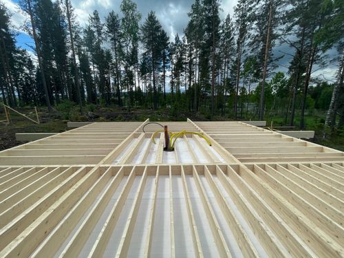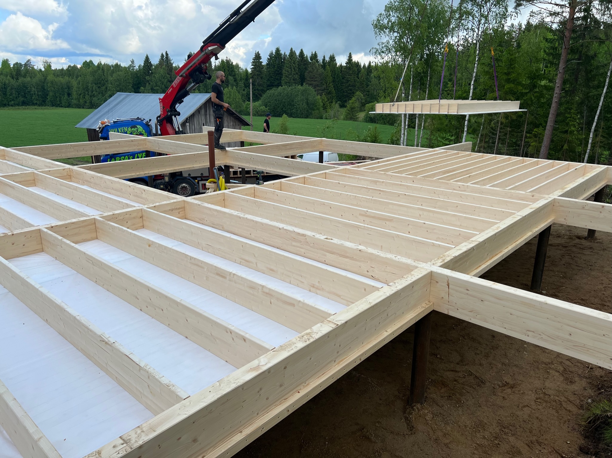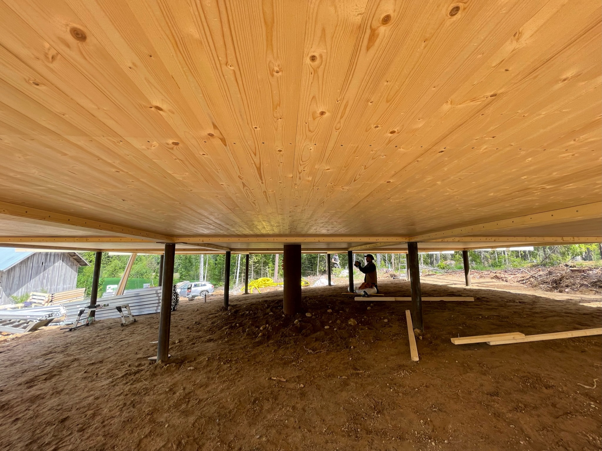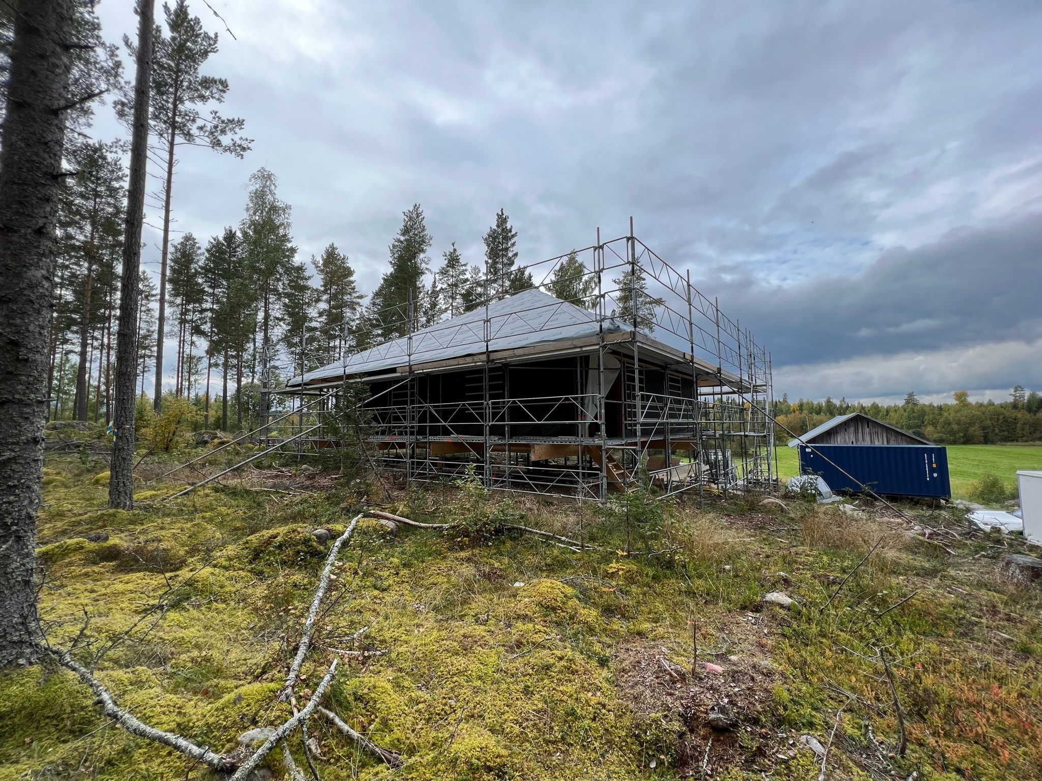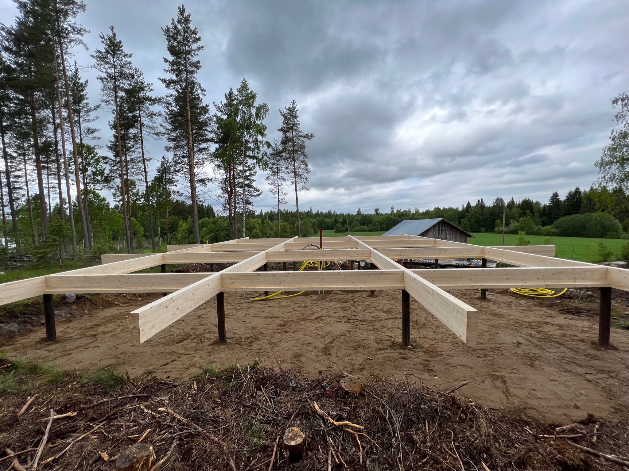 Fritidshus i Hälsingland med stomme och invändiga ytskikt av massivt KLT (korslimmat trä). Planlösningen är kvadratisk med stora fönster mot skog och sjö. Pyramidtakets överhäng skyddar mot värme på sommaren och mot snö på vintern men släpper in den låga vintersolen. Utvändig fasadpanel är av bränd och borstad furu.